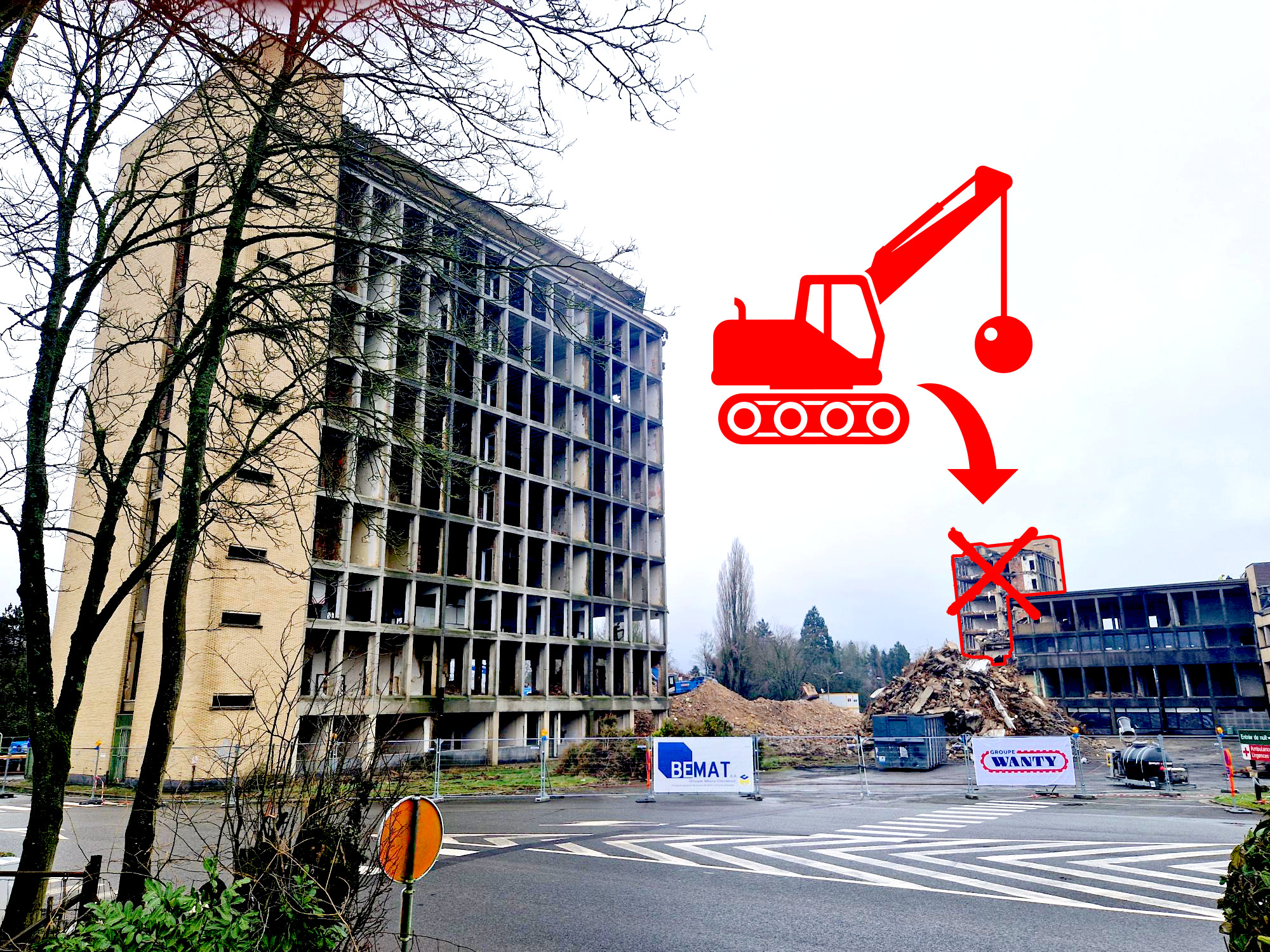La démolition du Rayon de Soleil avance à grands coups de grappin ! La partie centrale a disparu du paysage et il ne reste que les pignons, ainsi que l’aile menant à la rotonde. Grâce aux mesures prises, les impacts de ce chantier sont très fortement limités. Néanmoins, la destruction de ces pignons va entraîner des conséquences sur la mobilité.