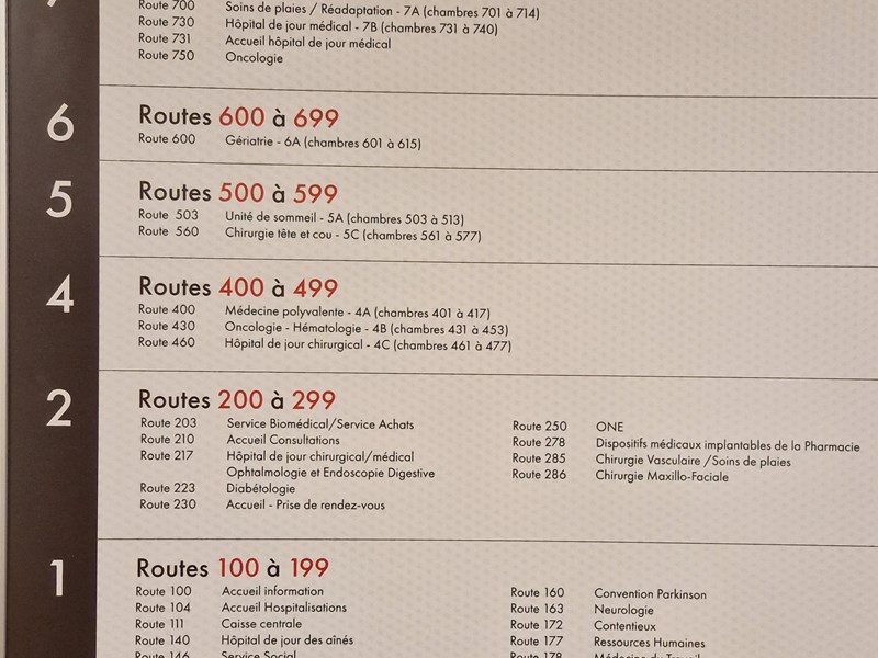 Vous pourrez facilement vous orienter à l'aide des panneaux d'affichage disposés à tous les endroits stratégiques de l'hôpital.